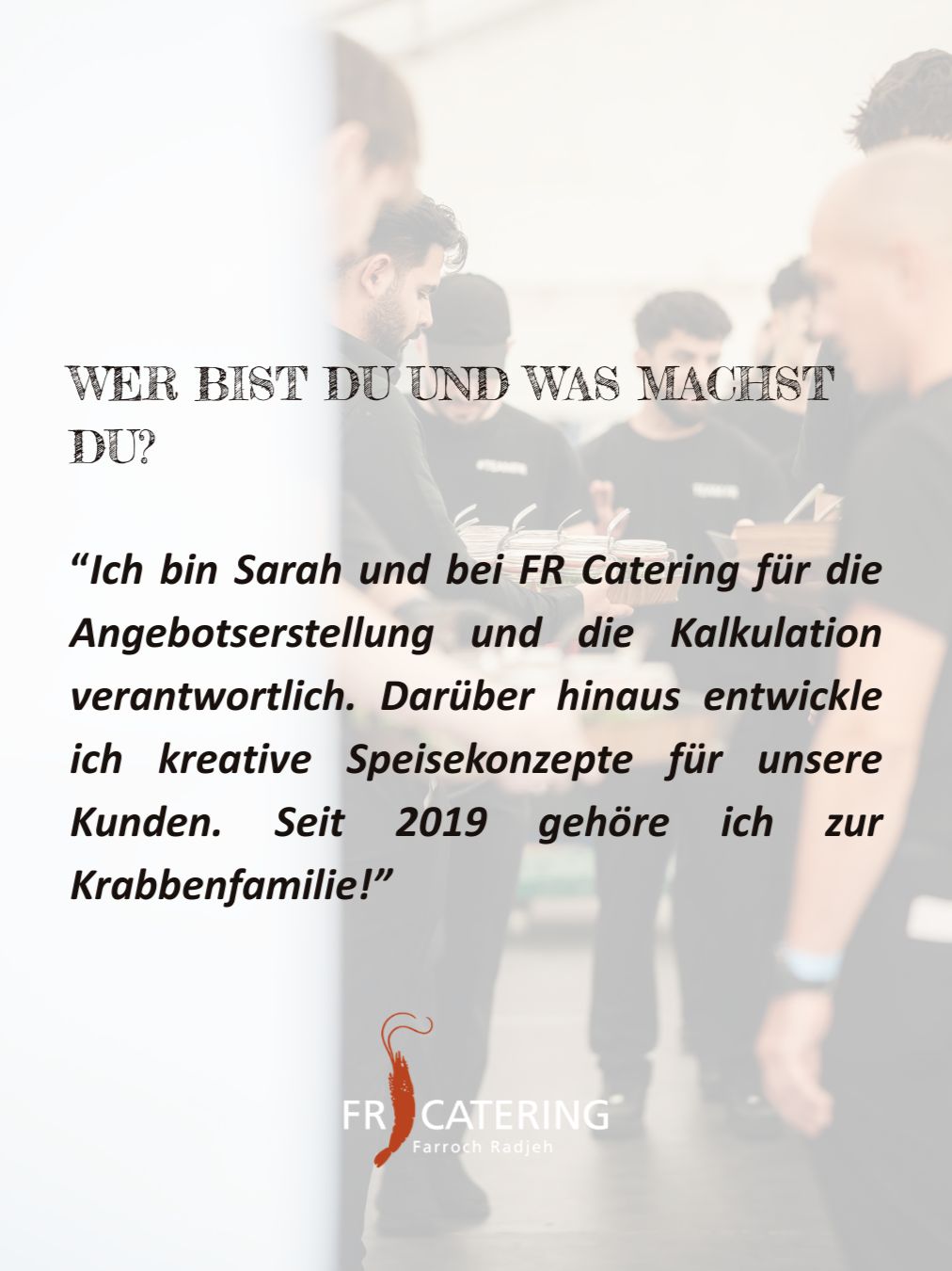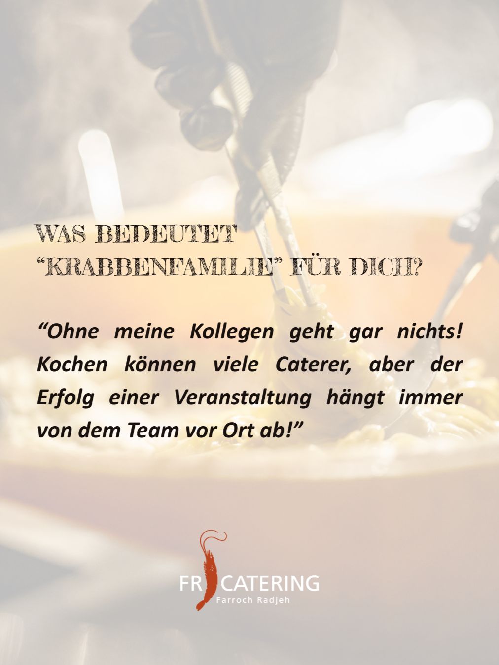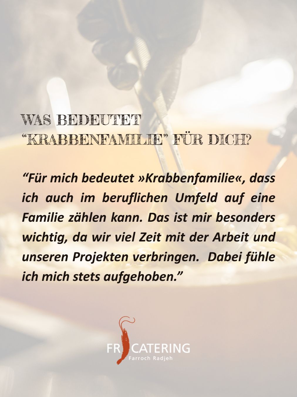 Für Bettina ist das Team ihre zweite Familie und Veranstaltungen ihr zweites Zuhause. Krabbenfamilie heißt für sie: zusammenhalten, Lösungen finden und niemals alleinstehen. Genau diese Haltung macht sie zu einem echten Herzstück unseres Teams.
